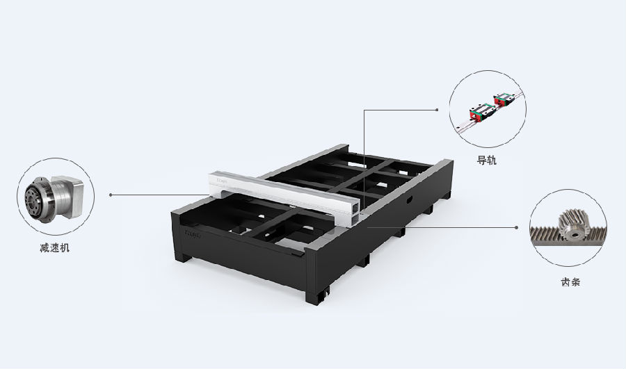 光纖激光切割機(jī)配備臺(tái)灣yyc齒條,日本新寶法蘭輸出減速機(jī)、臺(tái)灣上銀導(dǎo)軌。